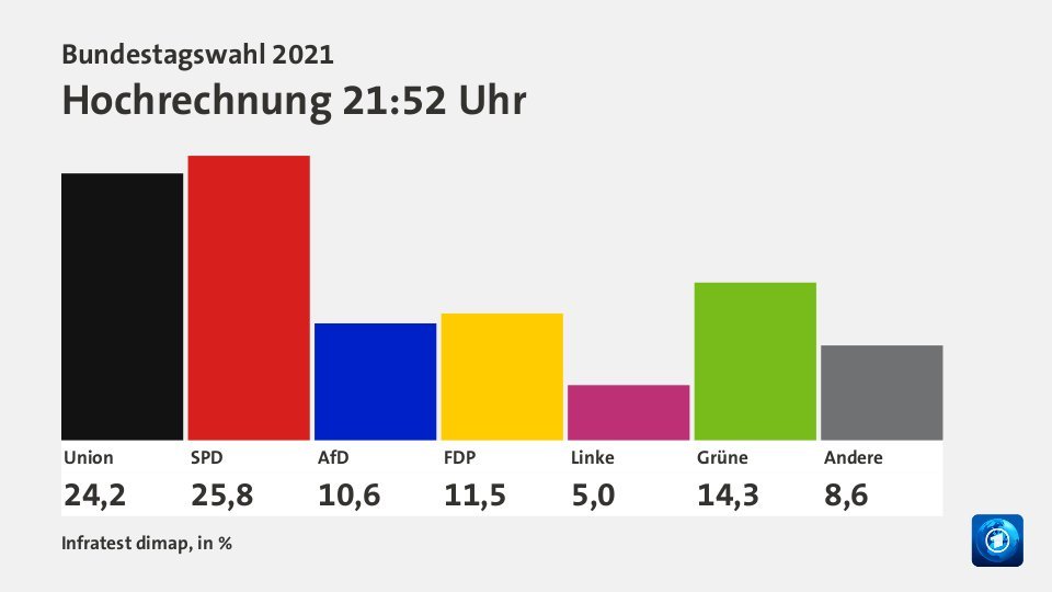 Die ARD-Hochrechnung von 1914 Uhr. Die Wahllokale haben um 18. Hochrechnung und alle Ergebnisse der Bundestagswahl 2021.